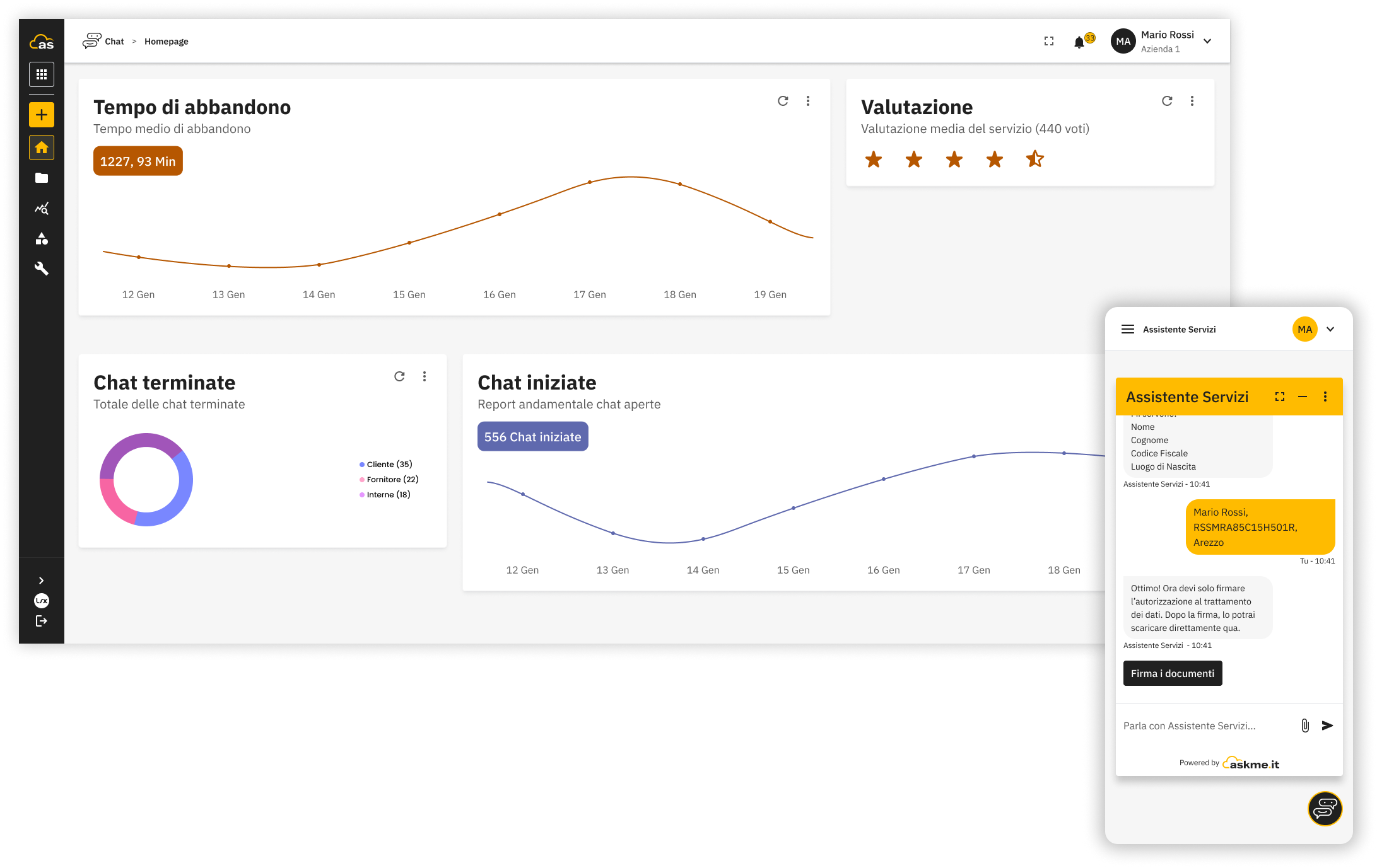 Intercetta i potenziali clienti, riduci le insoddisfazioni e porta la tua presenza online a un nuovo livello. Con il modulo Chat AskMe Chat abilita il self-service 24/7, fornisce risposte puntuali dalla knowledge base e garantisce un passaggio fluido all’operatore, perfettamente integrato nei tuoi processi.